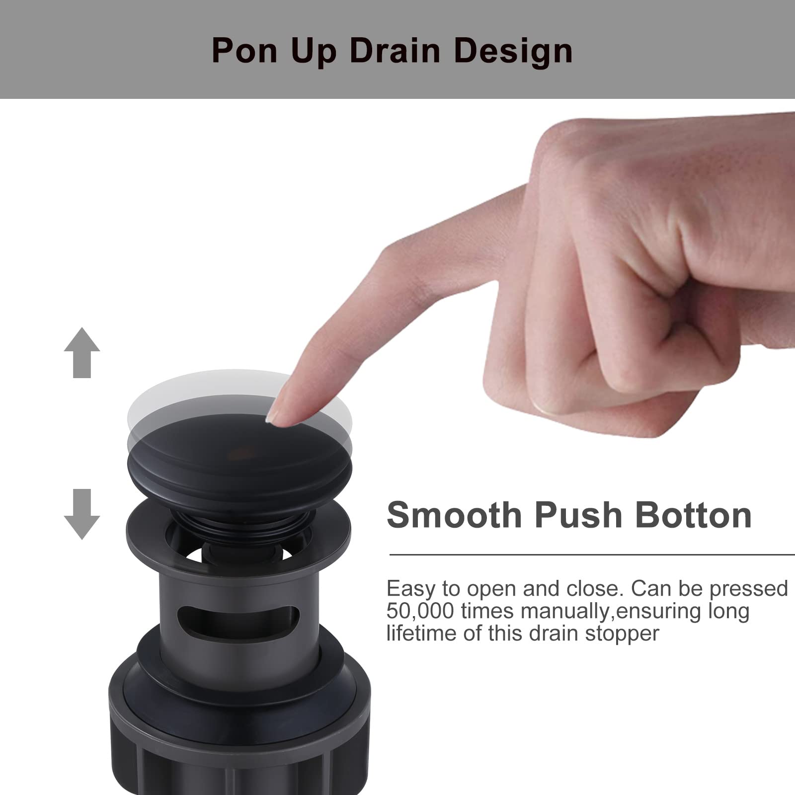 - 【Easy to Operate】Different from the lift rod drain, the pop up drain stopper simply push the drain cap down to close and to seal, push again to open and to drain water.